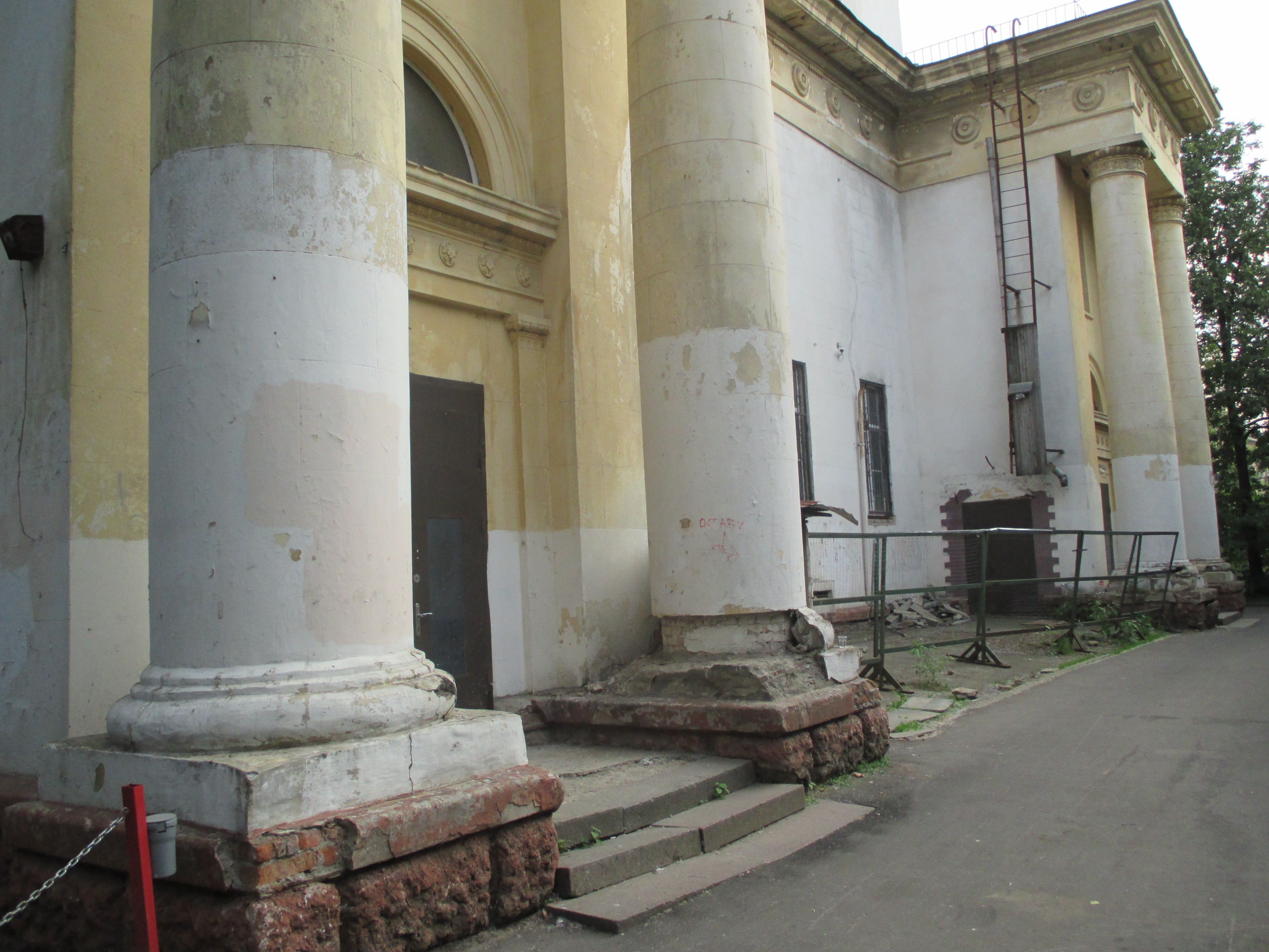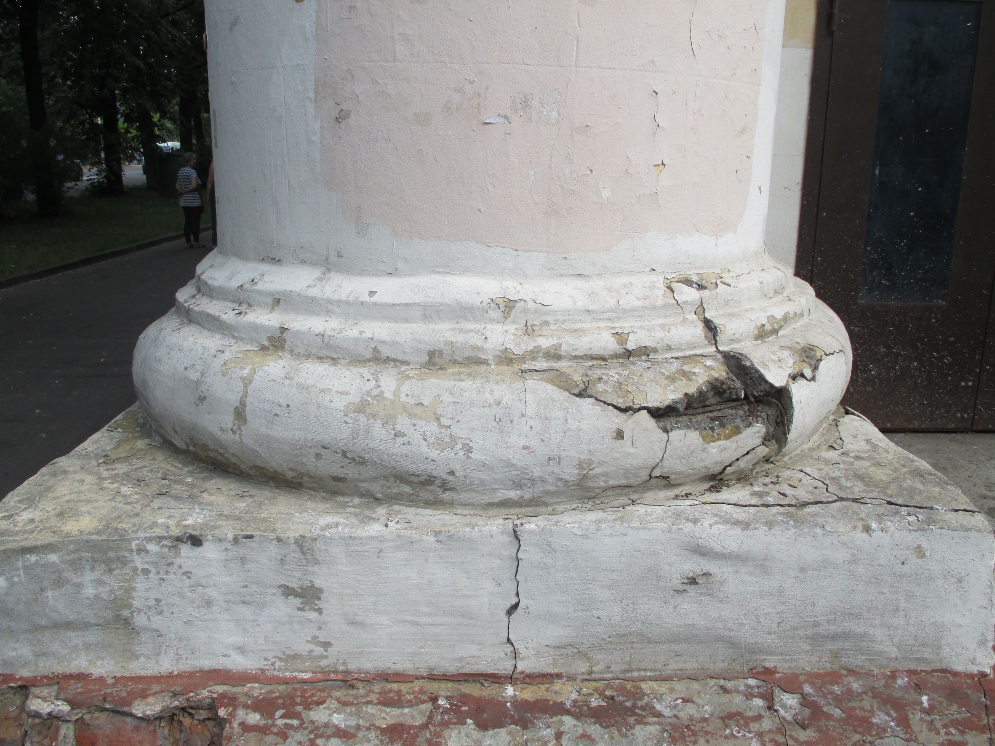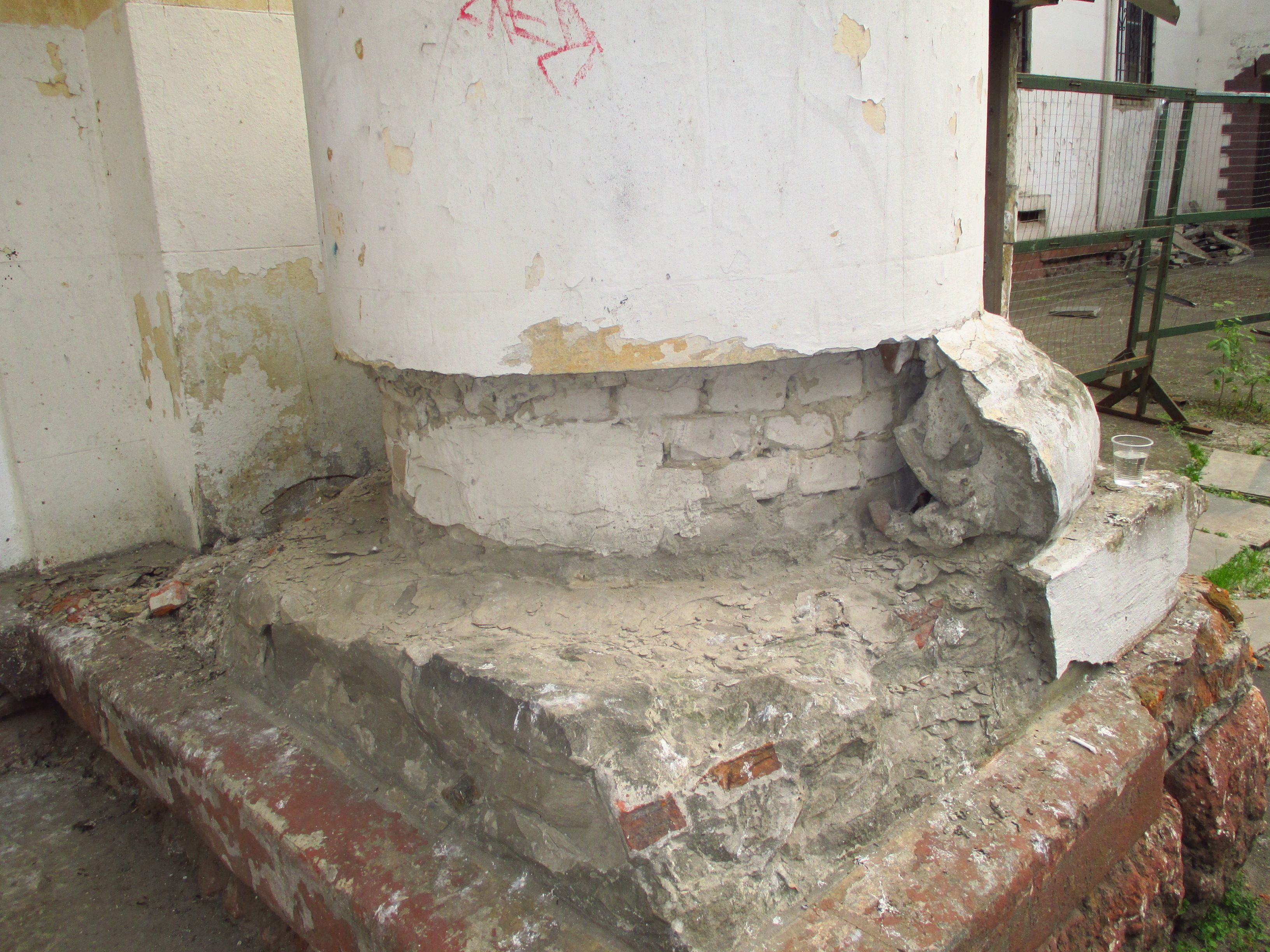 А вот как устроены колонны старых зданий изнутри. Внутри оказался кирпич, а вовсе не монолитный железобетон. Это задняя часть ДК Сталина на ул. Сталина, которая сейчас входит в состав Измайловской площади.