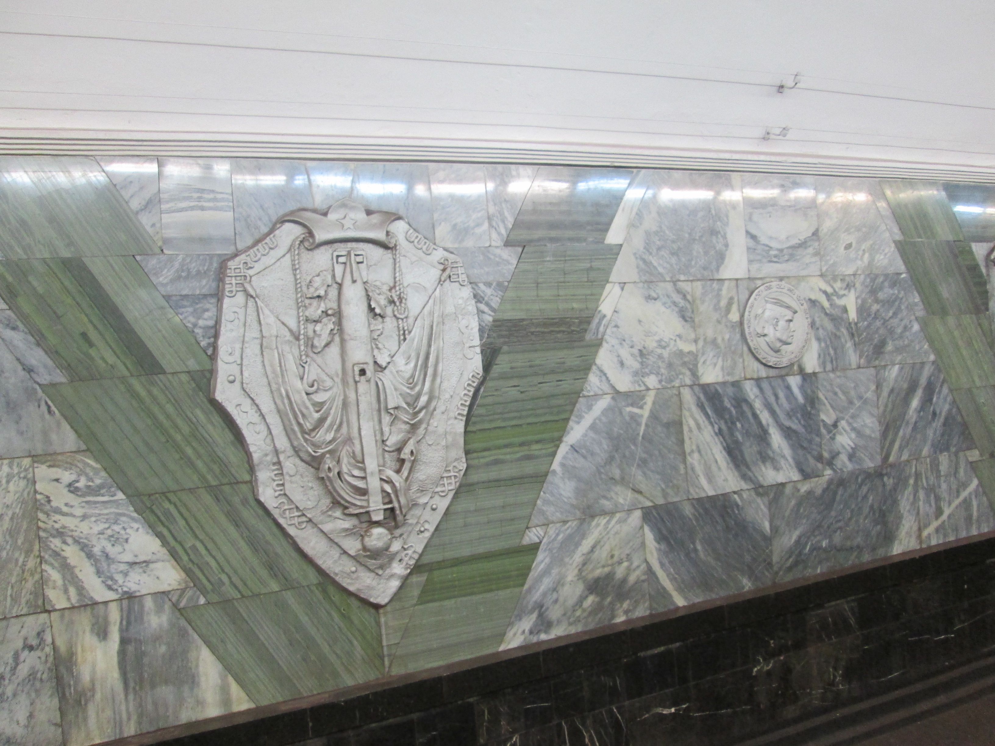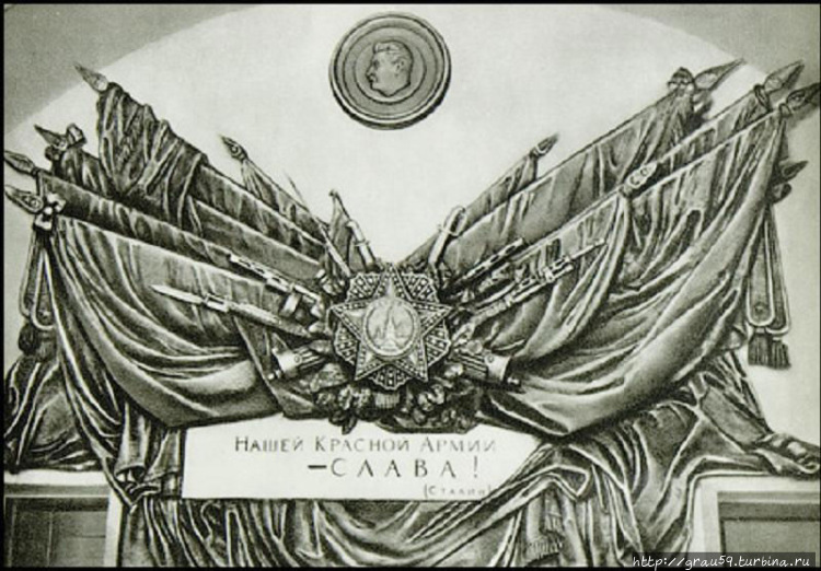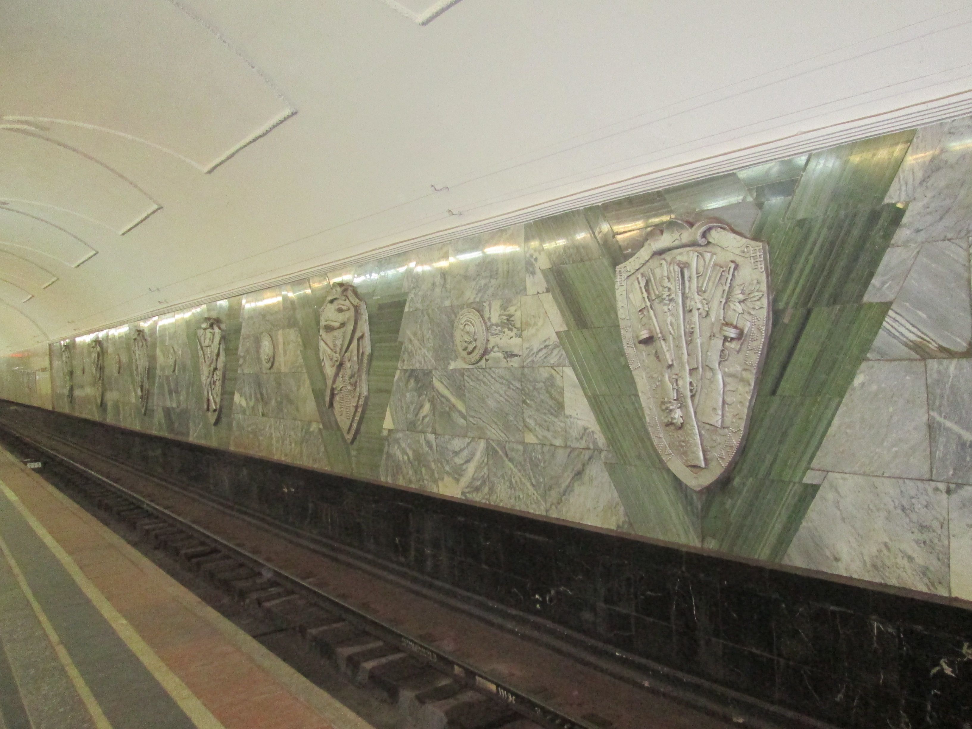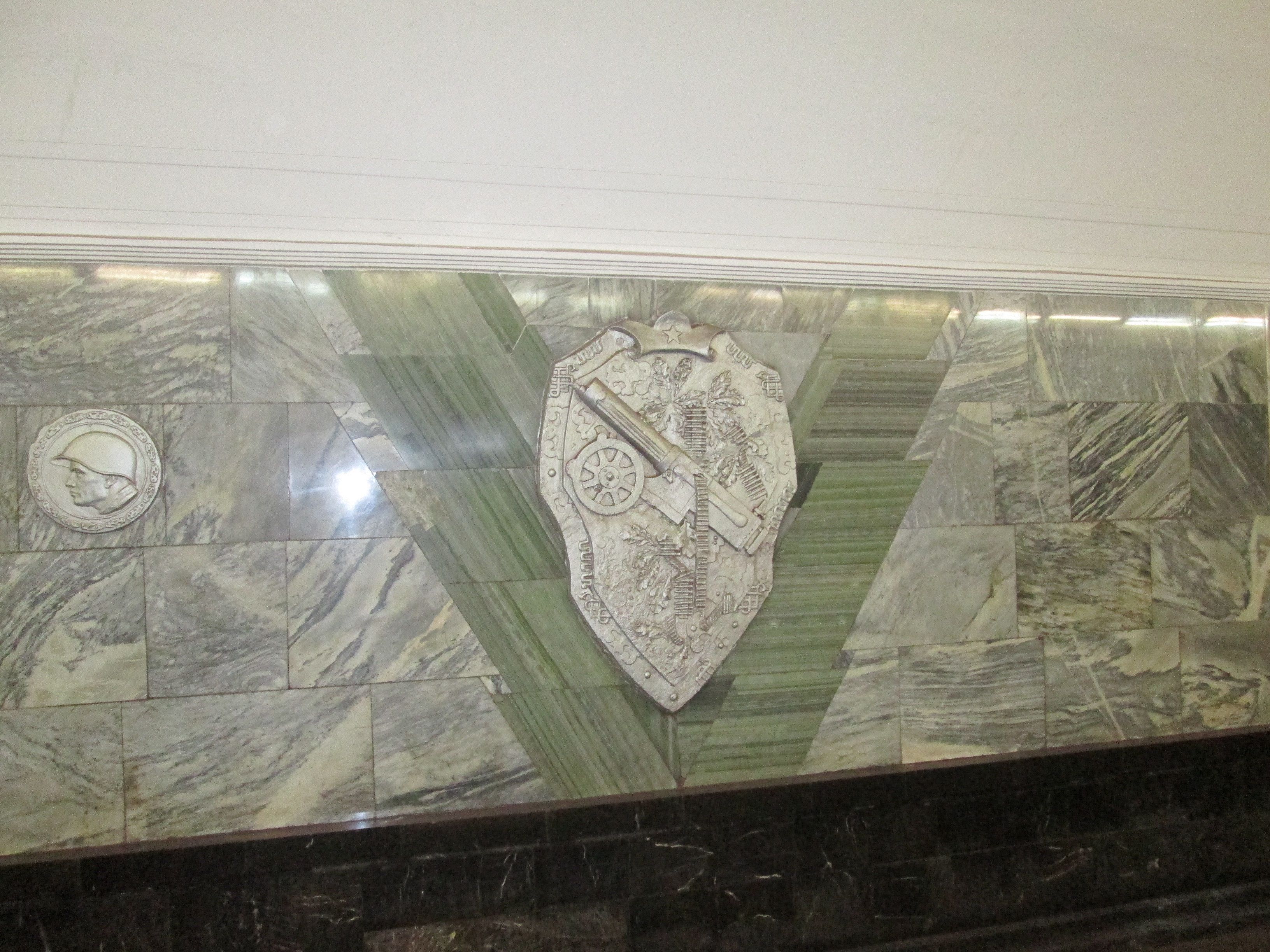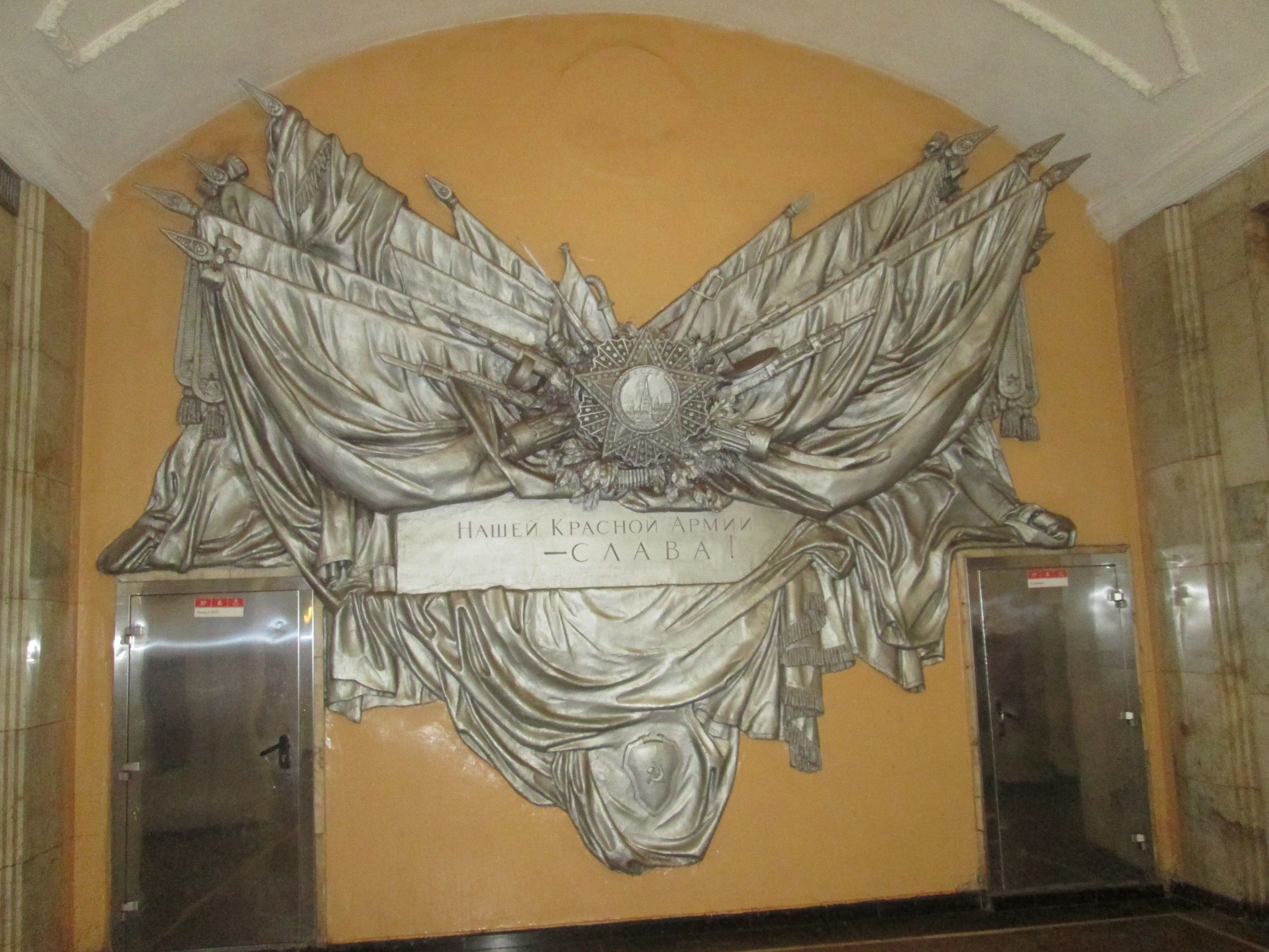 Красивая, необычная, глубокого заложенияВ конце станции барельеф цитатой из выступления И.В.СталинаИнтересно, что до XX съезда этот барельеф был чуть-чуть другим Снимал в 1951 г. на чёрно-белую плёнку, а не на цифру . Как видите — убрали слово «Сталин» и его барельеф сверху. Но в остальном всё как раньше.Прям колонный зал с поездами получился. Качественно, детально, с подробностями прорисованоДостойно того, что бы взглянуть отдельно на каждый барельефБомбы на головы врагов аж потоком сыплются.