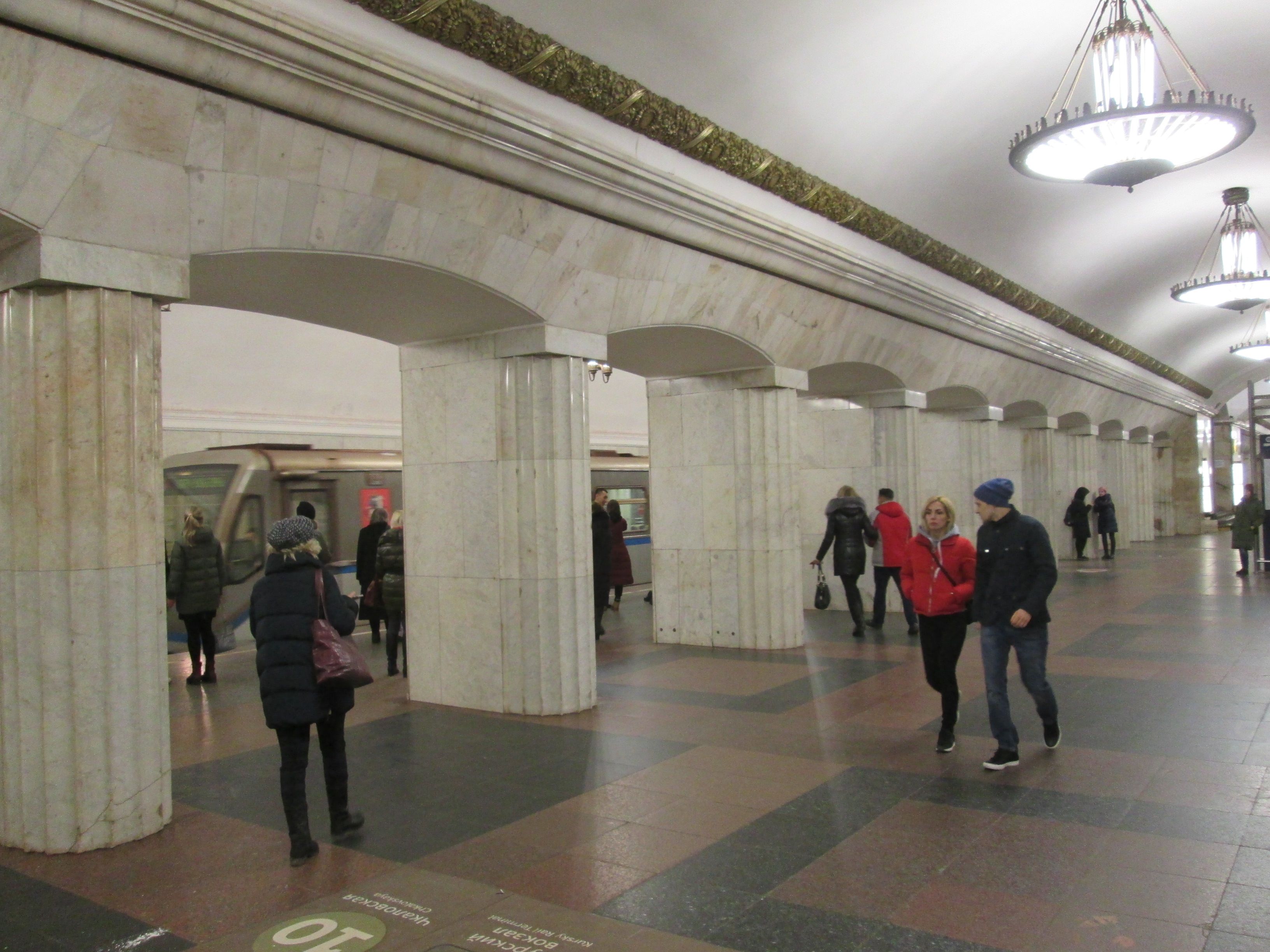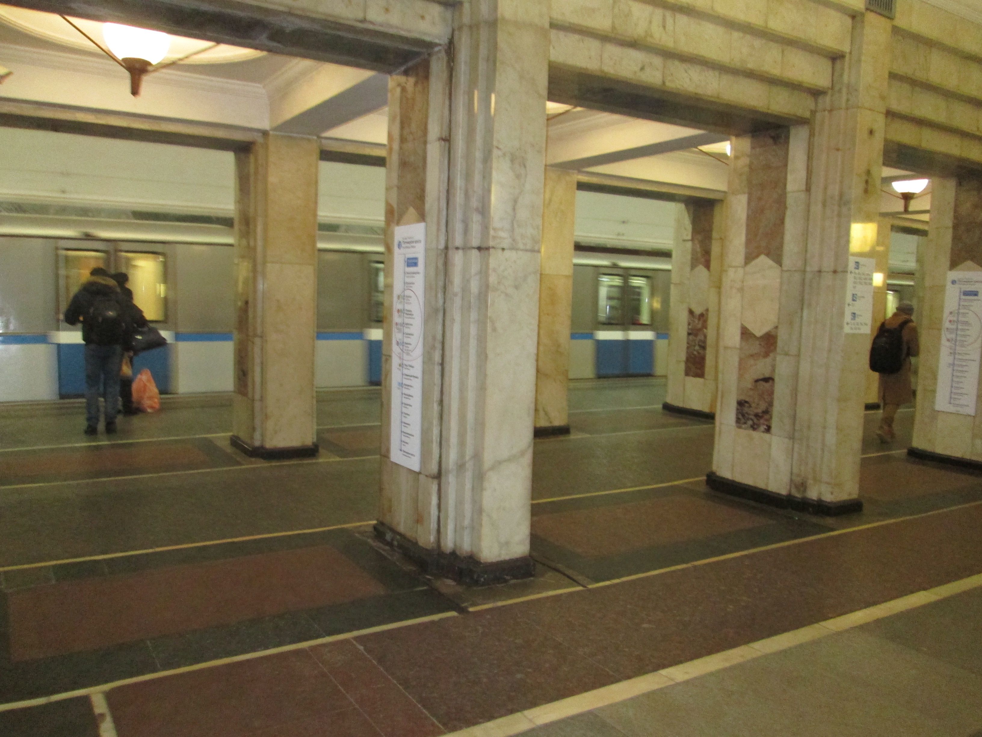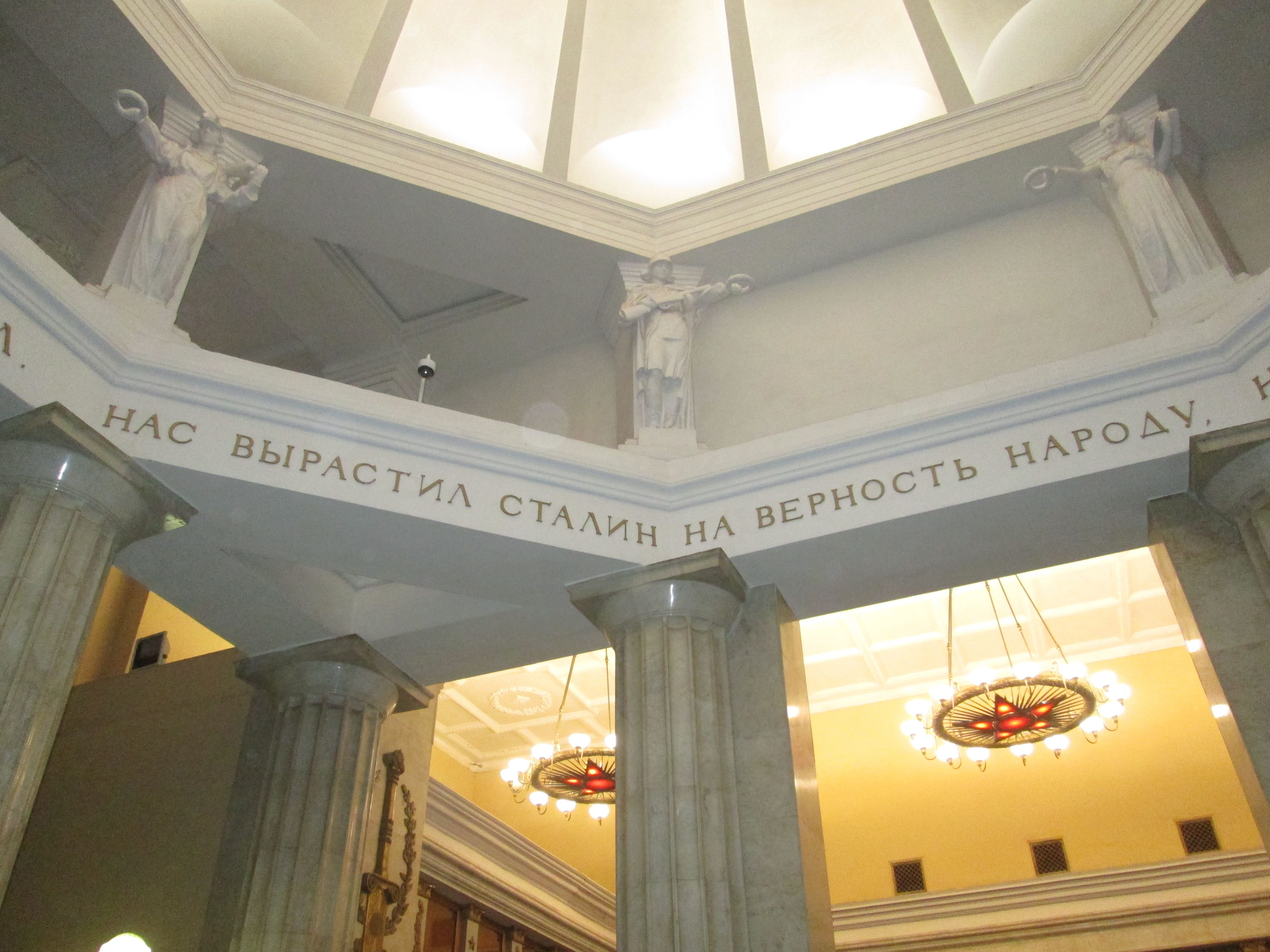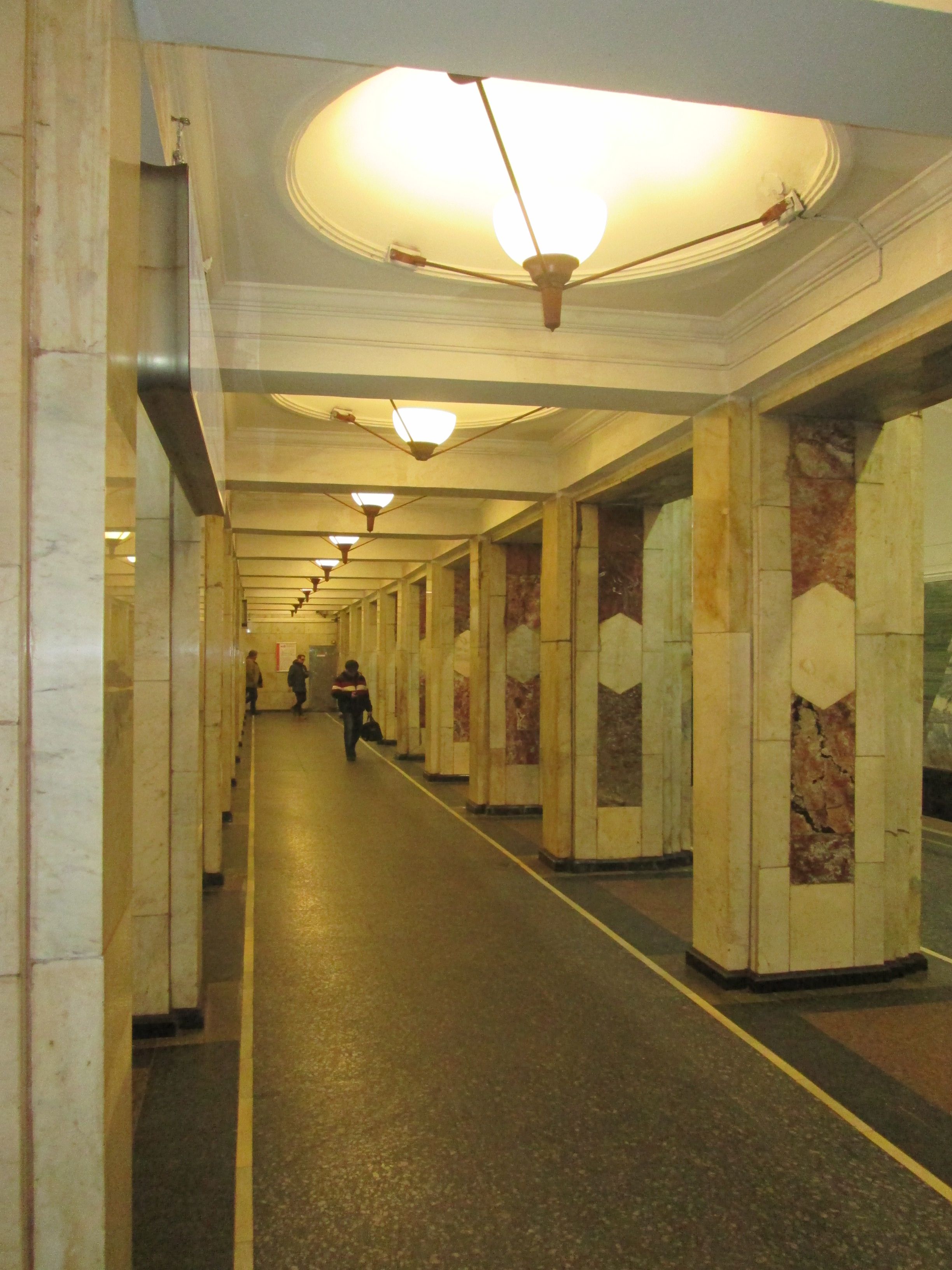 Красивая, необычная, глубокого заложенияВ конце станции барельеф цитатой из выступления И.В.СталинаИнтересно, что до XX съезда этот барельеф был чуть-чуть другим Снимал в 1951 г. на чёрно-белую плёнку, а не на цифру . Как видите — убрали слово «Сталин» и его барельеф сверху. Но в остальном всё как раньше.Прям колонный зал с поездами получился. Качественно, детально, с подробностями прорисованоДостойно того, что бы взглянуть отдельно на каждый барельефБомбы на головы врагов аж потоком сыплются.