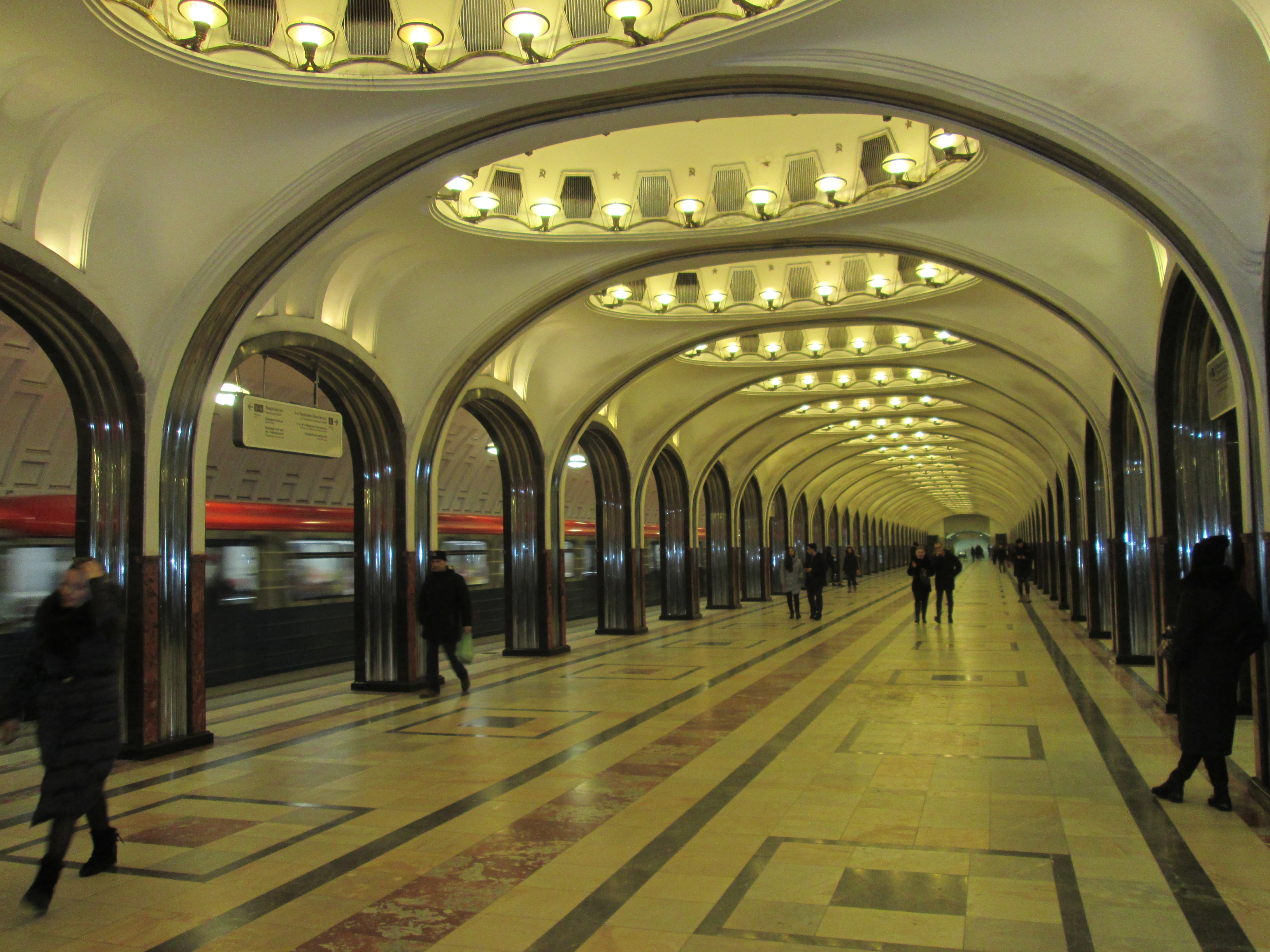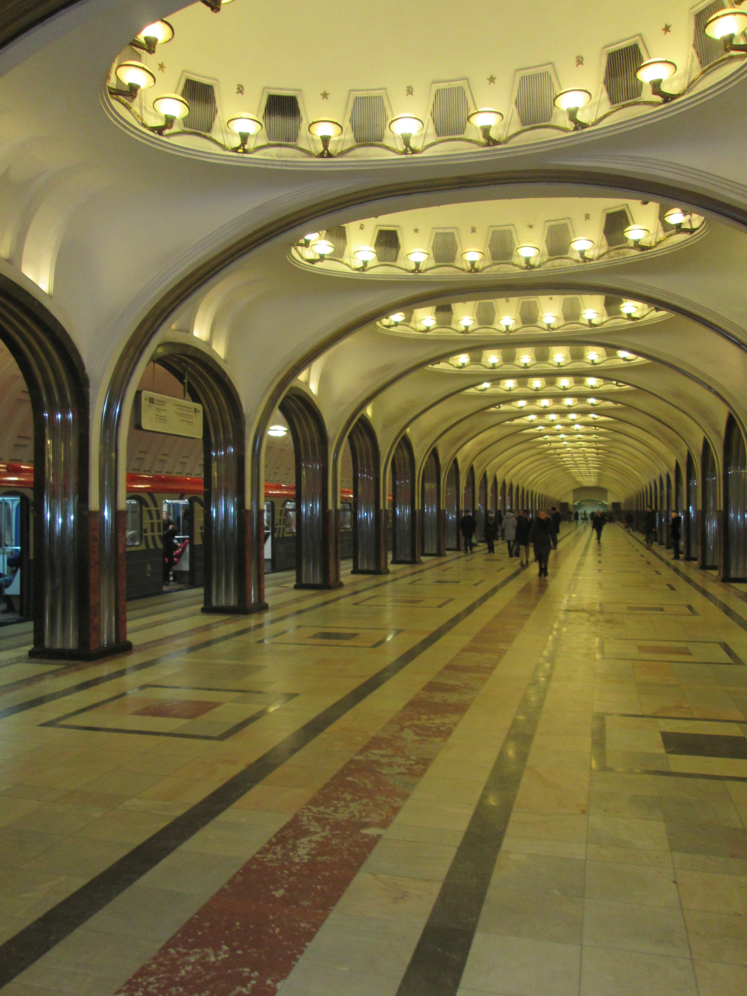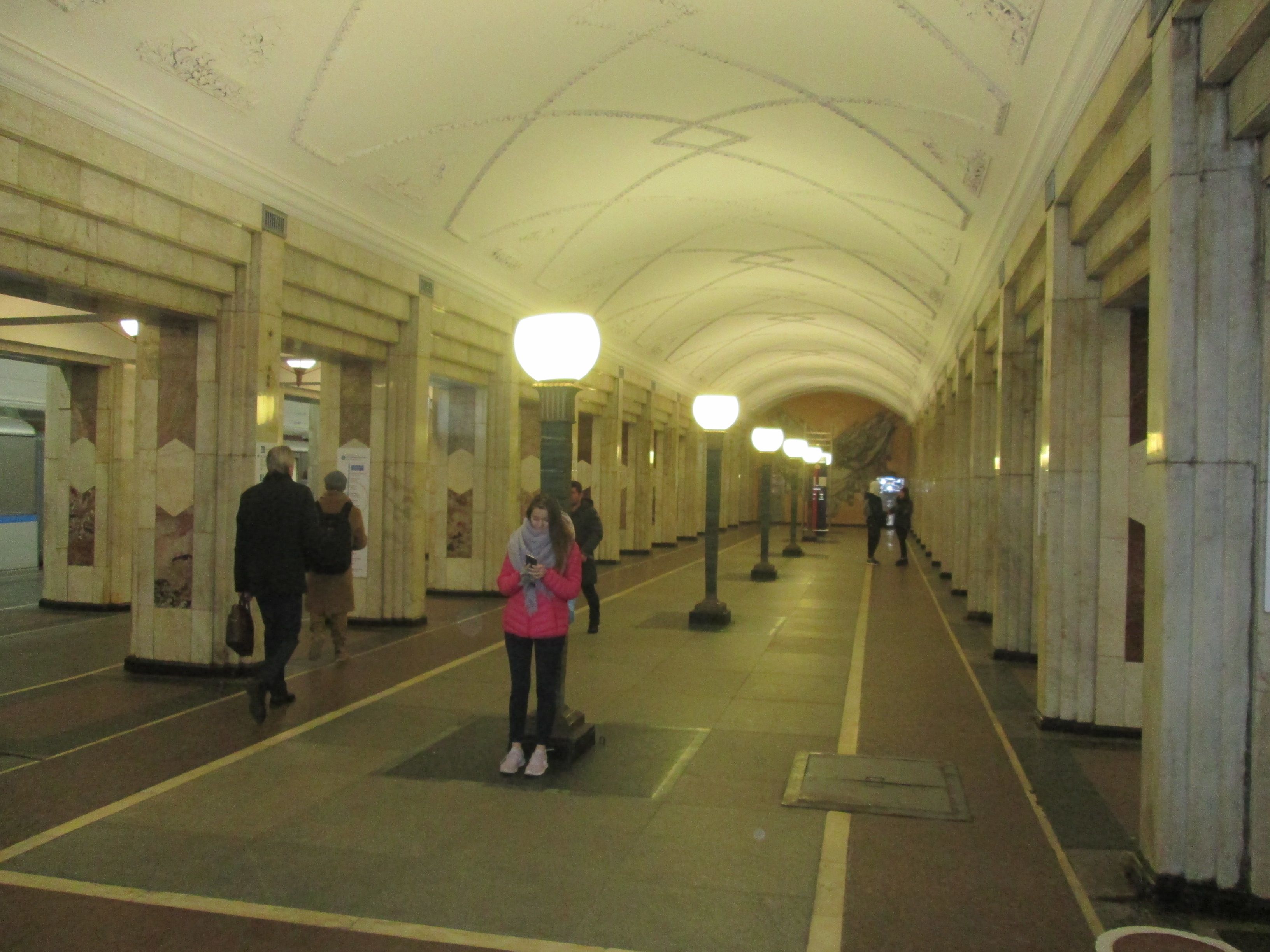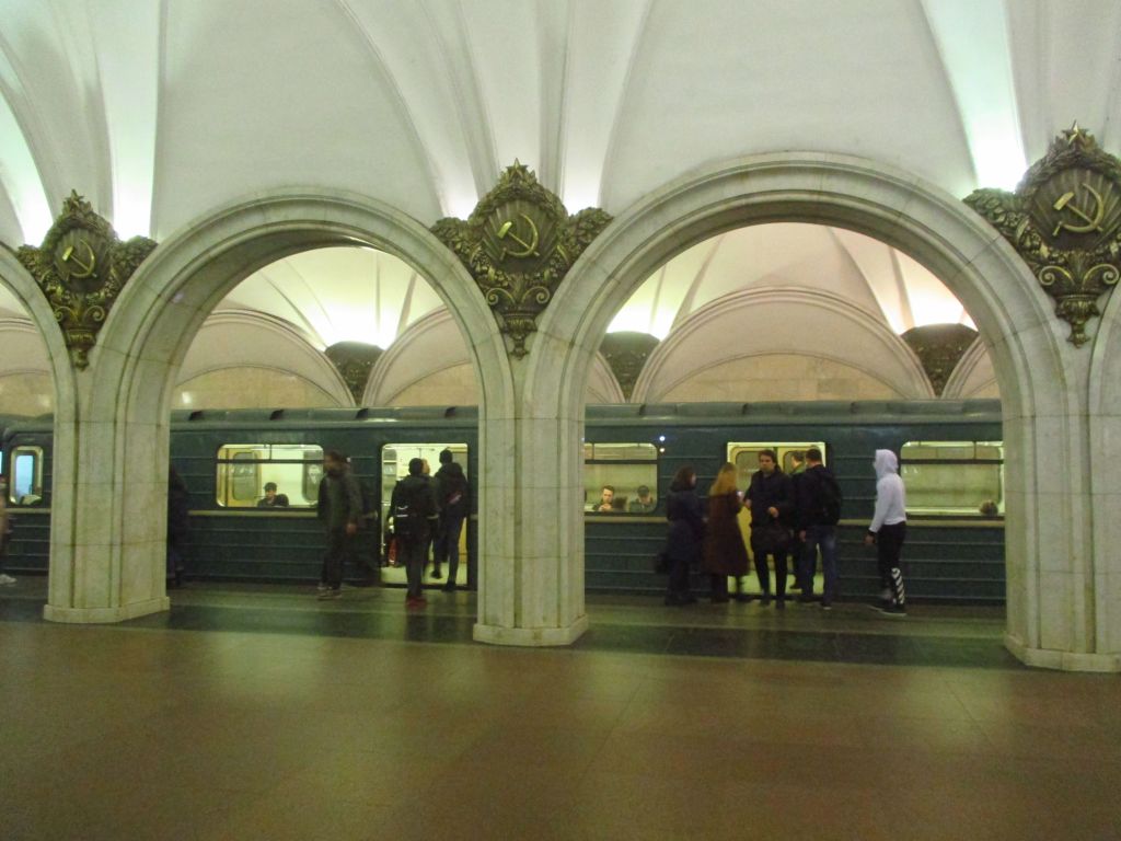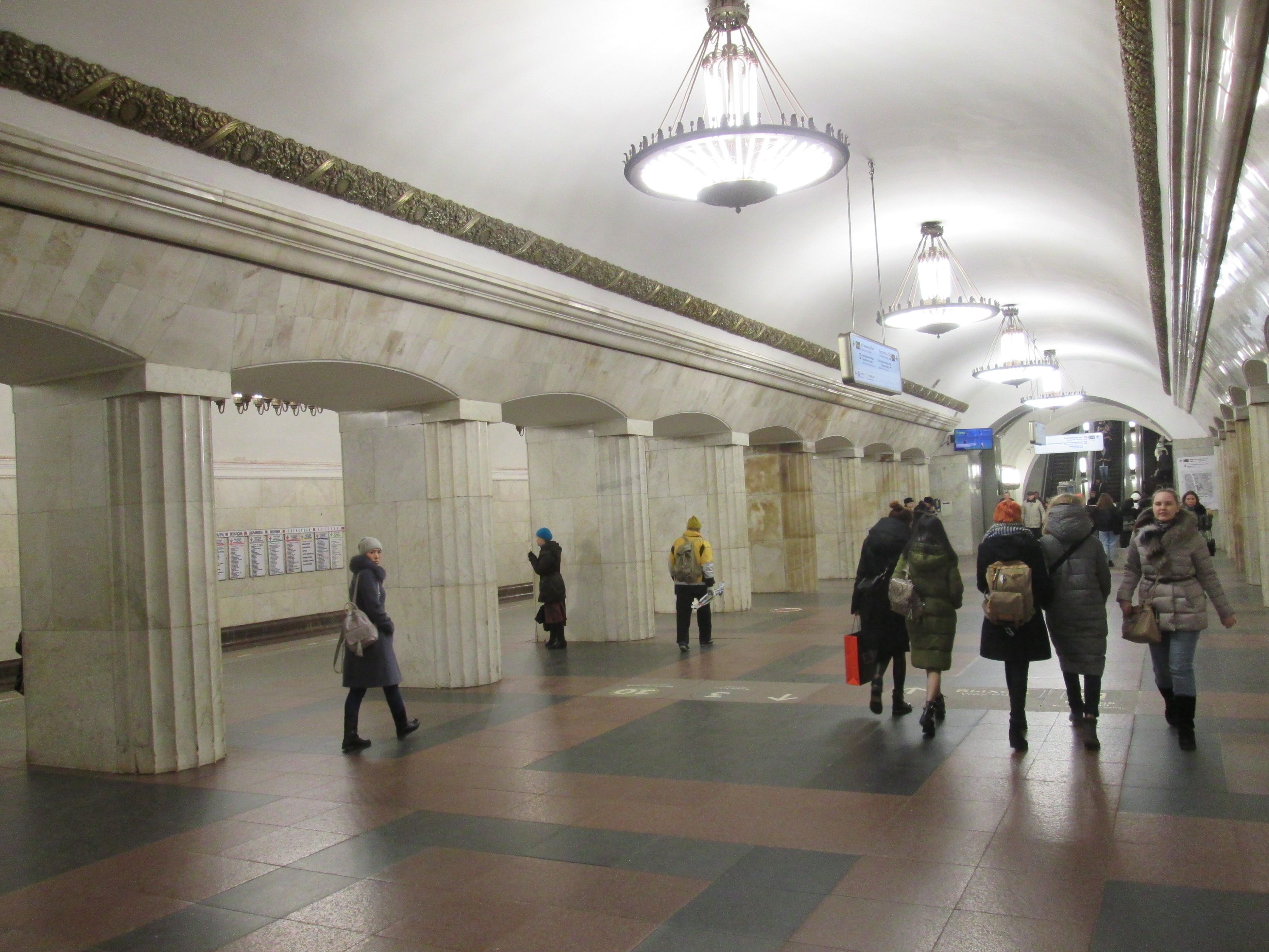 Красивая, необычная, глубокого заложенияВ конце станции барельеф цитатой из выступления И.В.СталинаИнтересно, что до XX съезда этот барельеф был чуть-чуть другим Снимал в 1951 г. на чёрно-белую плёнку, а не на цифру . Как видите — убрали слово «Сталин» и его барельеф сверху. Но в остальном всё как раньше.Прям колонный зал с поездами получился. Качественно, детально, с подробностями прорисованоДостойно того, что бы взглянуть отдельно на каждый барельефБомбы на головы врагов аж потоком сыплются.