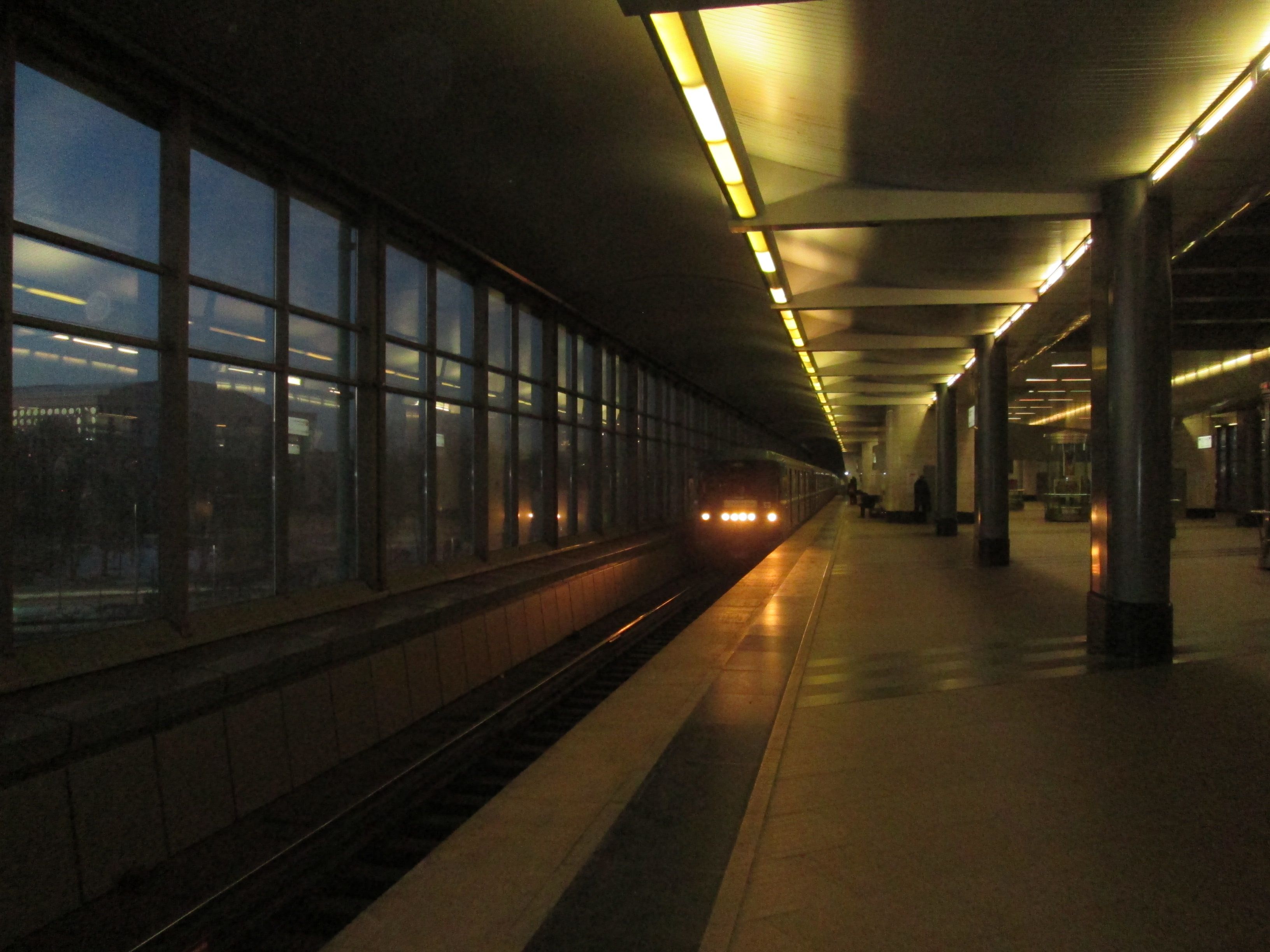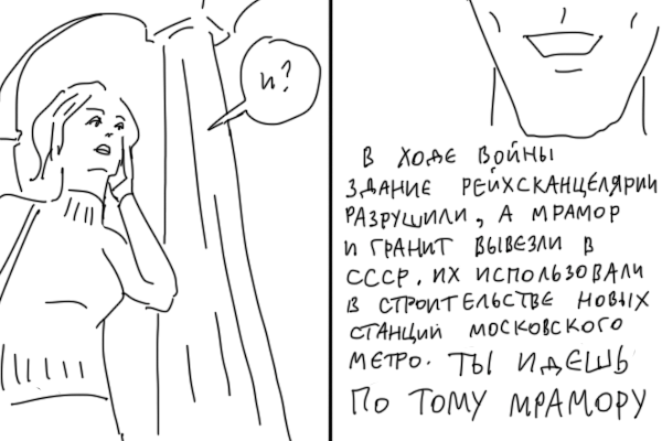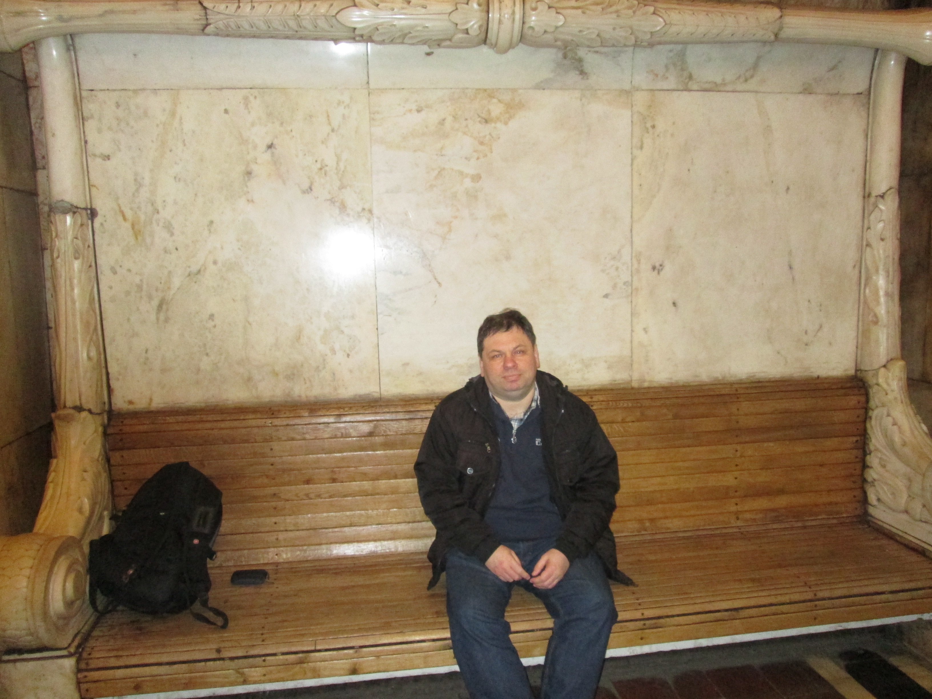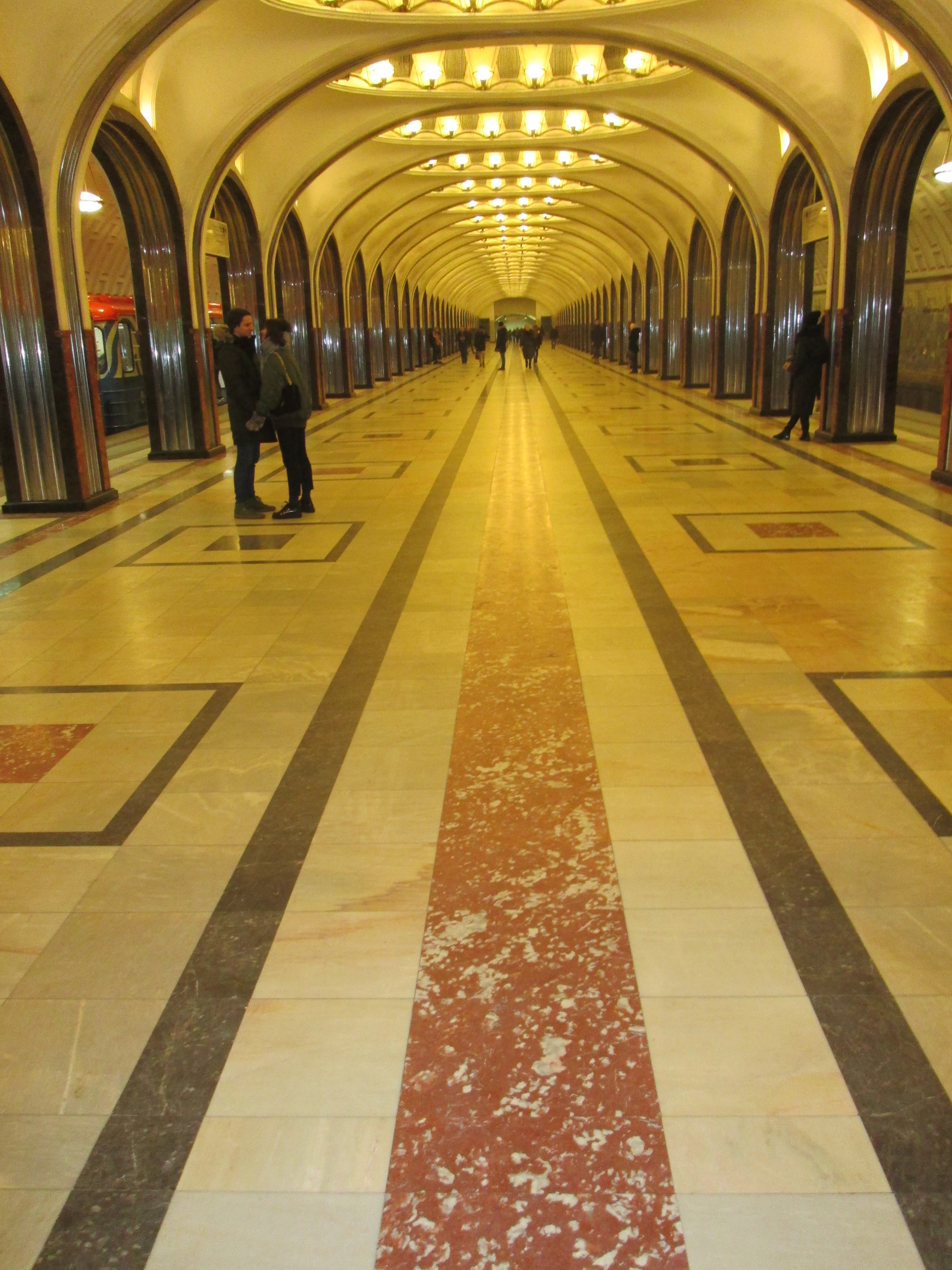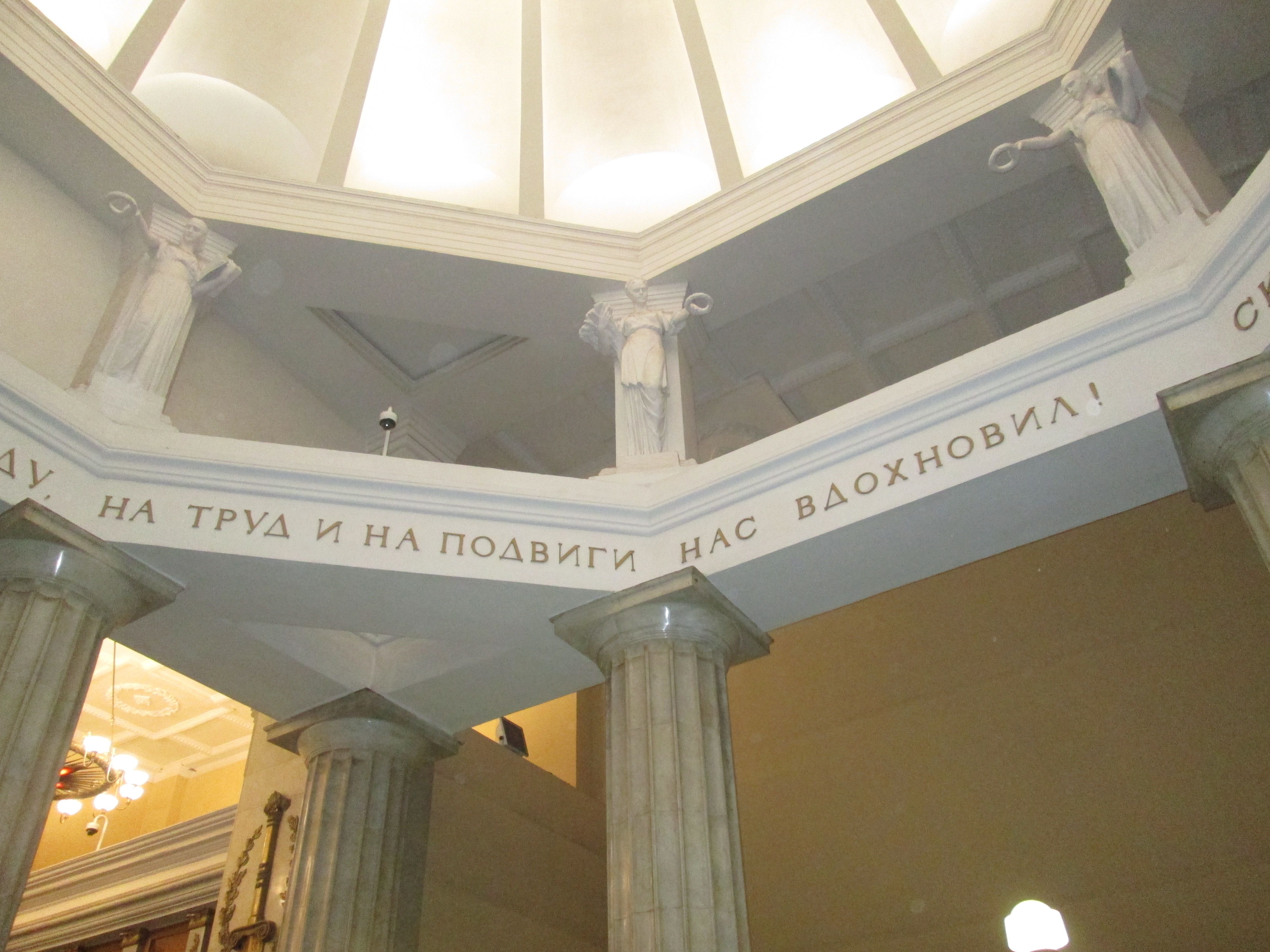 Красивая, необычная, глубокого заложенияВ конце станции барельеф цитатой из выступления И.В.СталинаИнтересно, что до XX съезда этот барельеф был чуть-чуть другим Снимал в 1951 г. на чёрно-белую плёнку, а не на цифру . Как видите — убрали слово «Сталин» и его барельеф сверху. Но в остальном всё как раньше.Прям колонный зал с поездами получился. Качественно, детально, с подробностями прорисованоДостойно того, что бы взглянуть отдельно на каждый барельефБомбы на головы врагов аж потоком сыплются.