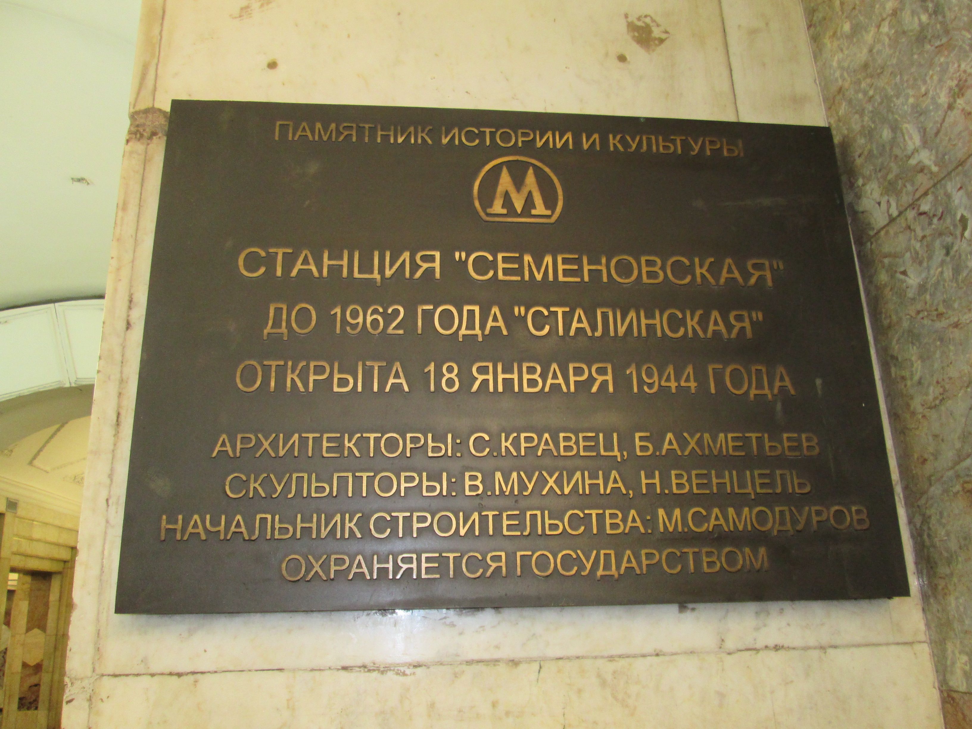 Станция метро «Семёновская», бывшая «Сталинская». («Бауманская» — «Электрозаводская» — «Семёновская»).