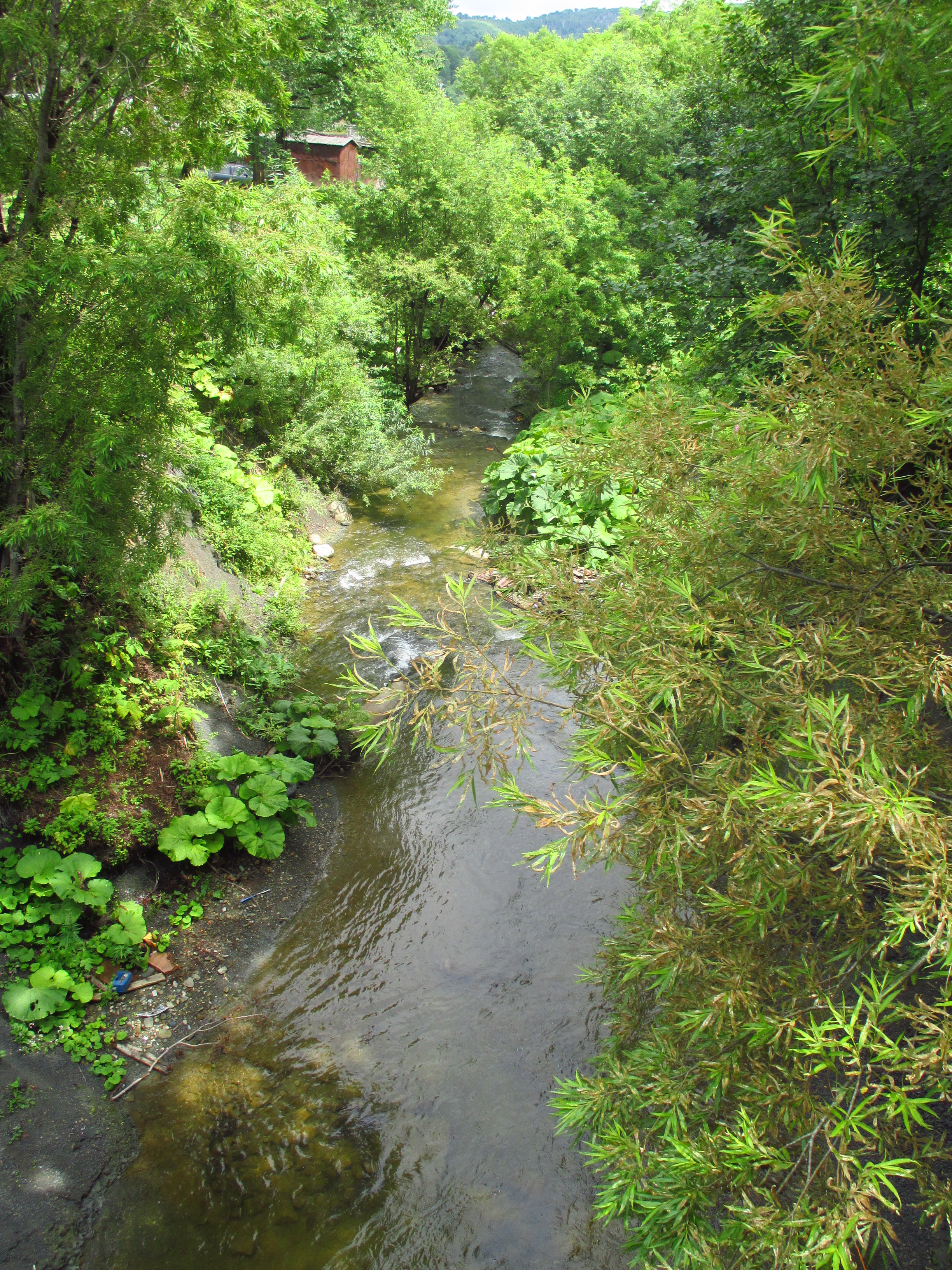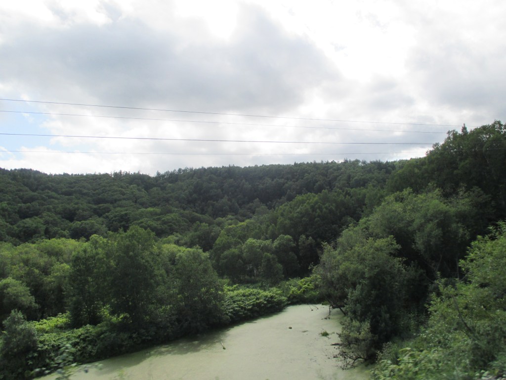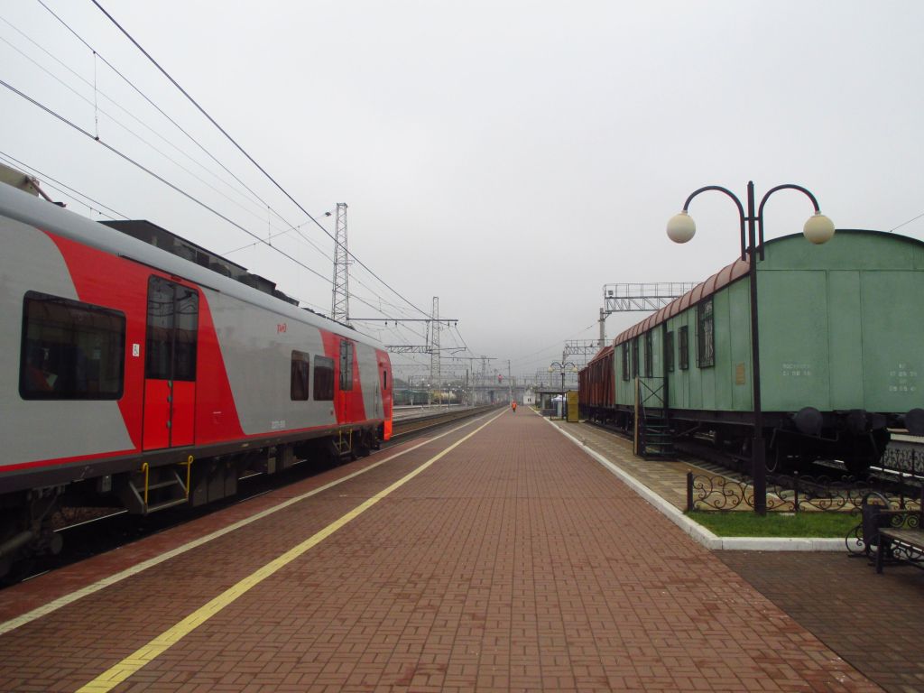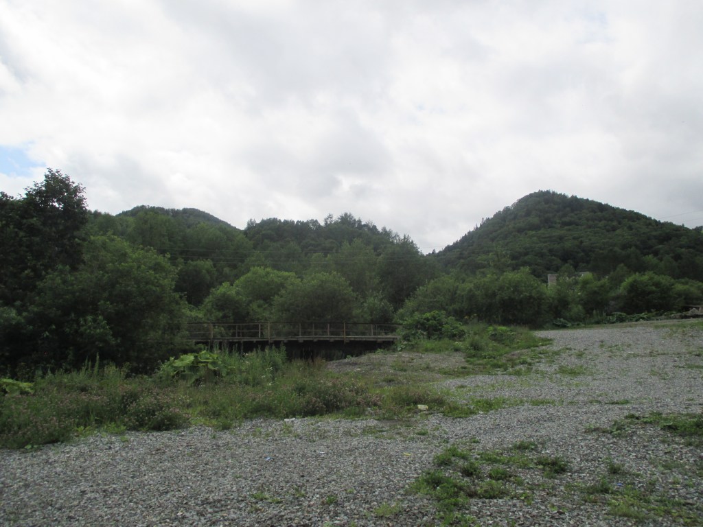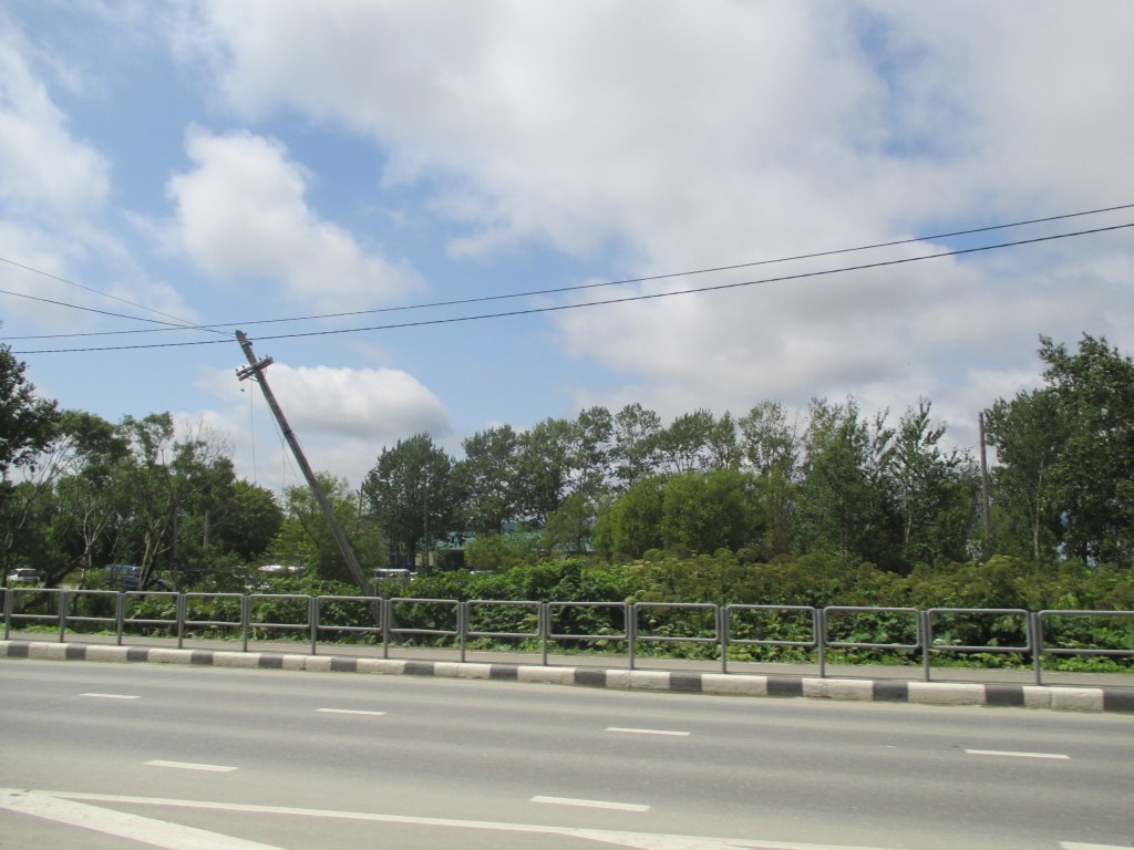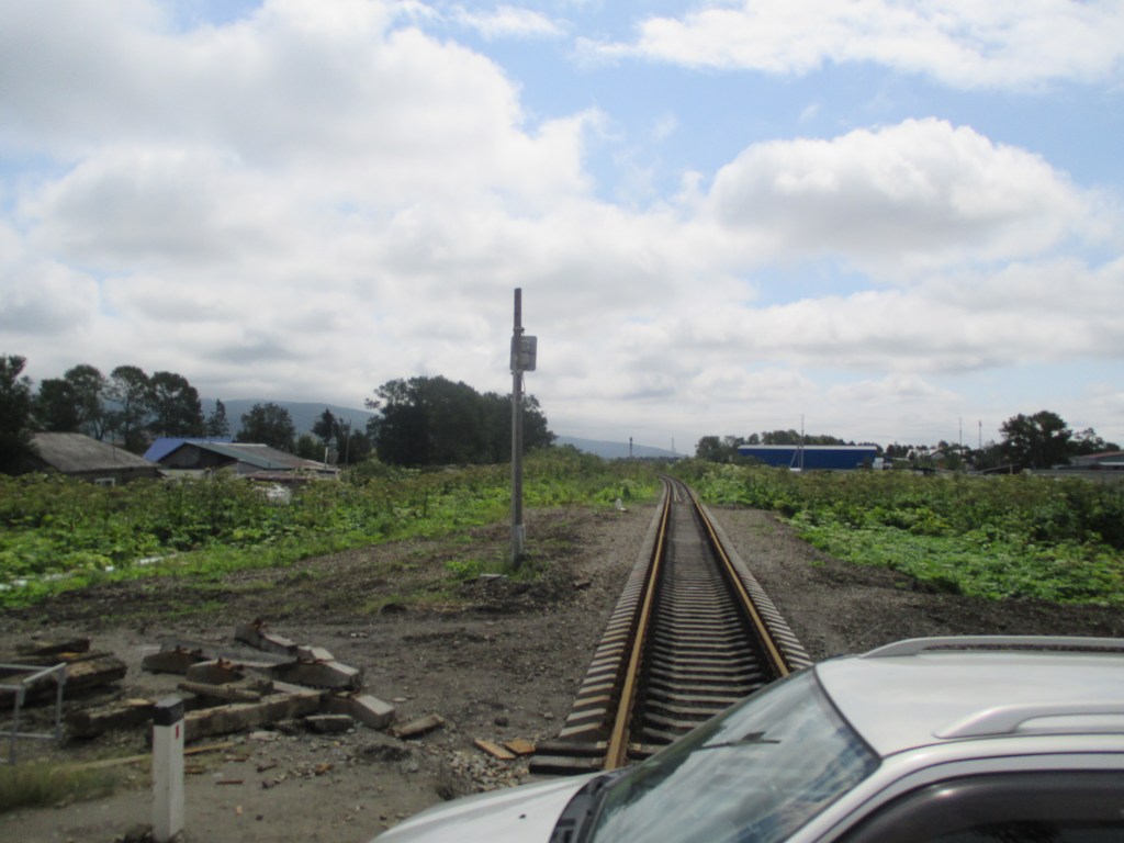 ЖД насыпь слева. Поездов не было ни одного потому, что пока я тут был, как раз полотно меняли с японского на российский стандарт. По всему острову. Разом. Вот уже новое полотно. Правильное.