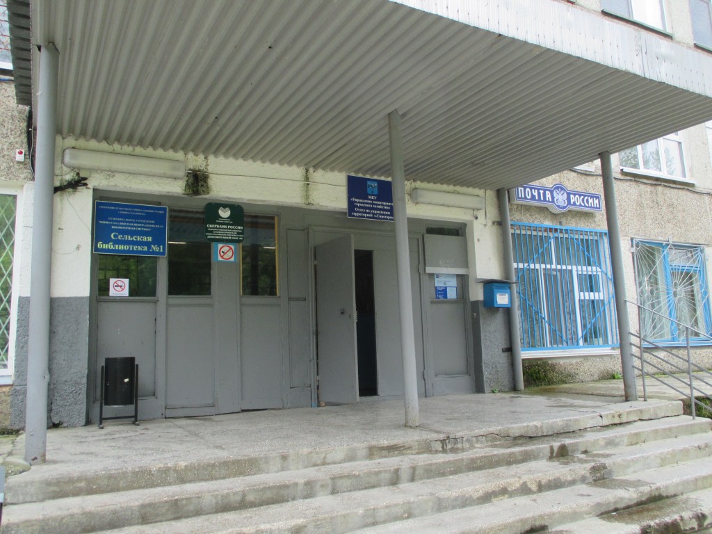 Местная школа. Исправная. Там дети поют. Слышно было. Почта в ней есть. «Почта России». Административное что-то и «Сбербанк».