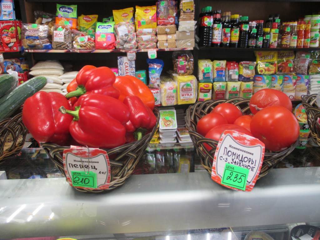 Цены в магазинах минимум 2Х к Москве или Екатеринбургу. Особенно овощи и фрукты дорогие. Всё китайское. Доставка паромами и самолётами. Фрукты 5Х. Еда тут ОООЧЕНЬ дорогая. Рыба дорогая (???). Всё дорогое. Как они тут выживают — не понятно.